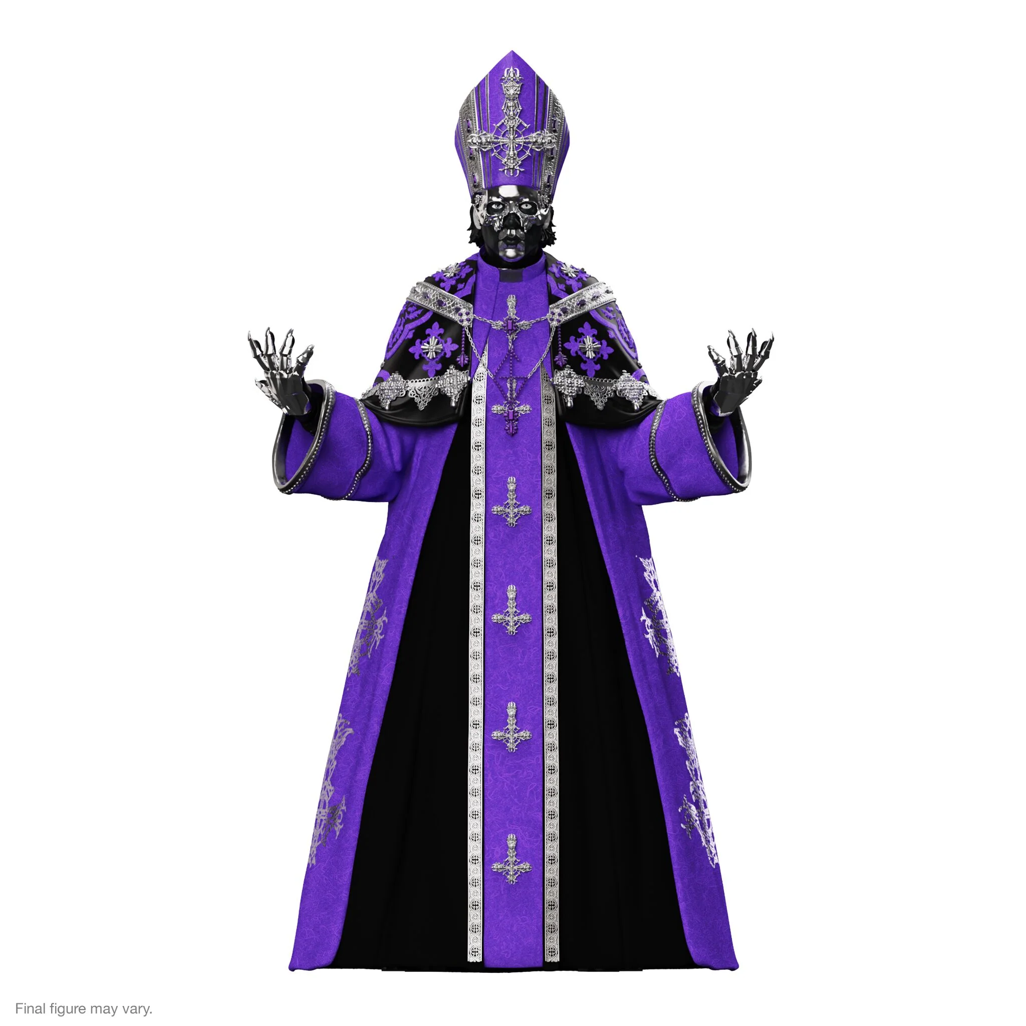The reign of Papa V Perpetua is upon us—resplendent, commanding, and steeped in the dark pageantry that has made Ghost a force to be reckoned with. With each new era, The Clergy’s unholy frontman evolves, and now, Super7 is summoning his latest incarnation to take center stage in your collection! This 7” scale, highly articulated ULTIMATES! figure embodies Papa V Perpetua’s divine decadence, featuring intricate sculpt and vac metal paint detailing that captures every ornate flourish of his ever-enigmatic presence. Draped in a flowing soft goods robe with detailing approved by The Clergy and worthy of his station, he arrives with two interchangeable heads and eight interchangeable hands, allowing you to display him in all his theatrical splendor. And, of course, he comes equipped with his tools of the trade—a microphone and stand—so he can deliver his haunting sermon among your collection. Encased in collector-friendly window box packaging, this figure is as much a relic as it is a revelation. Will you heed the call and usher Papa V Perpetua into your unholy sanctuary?